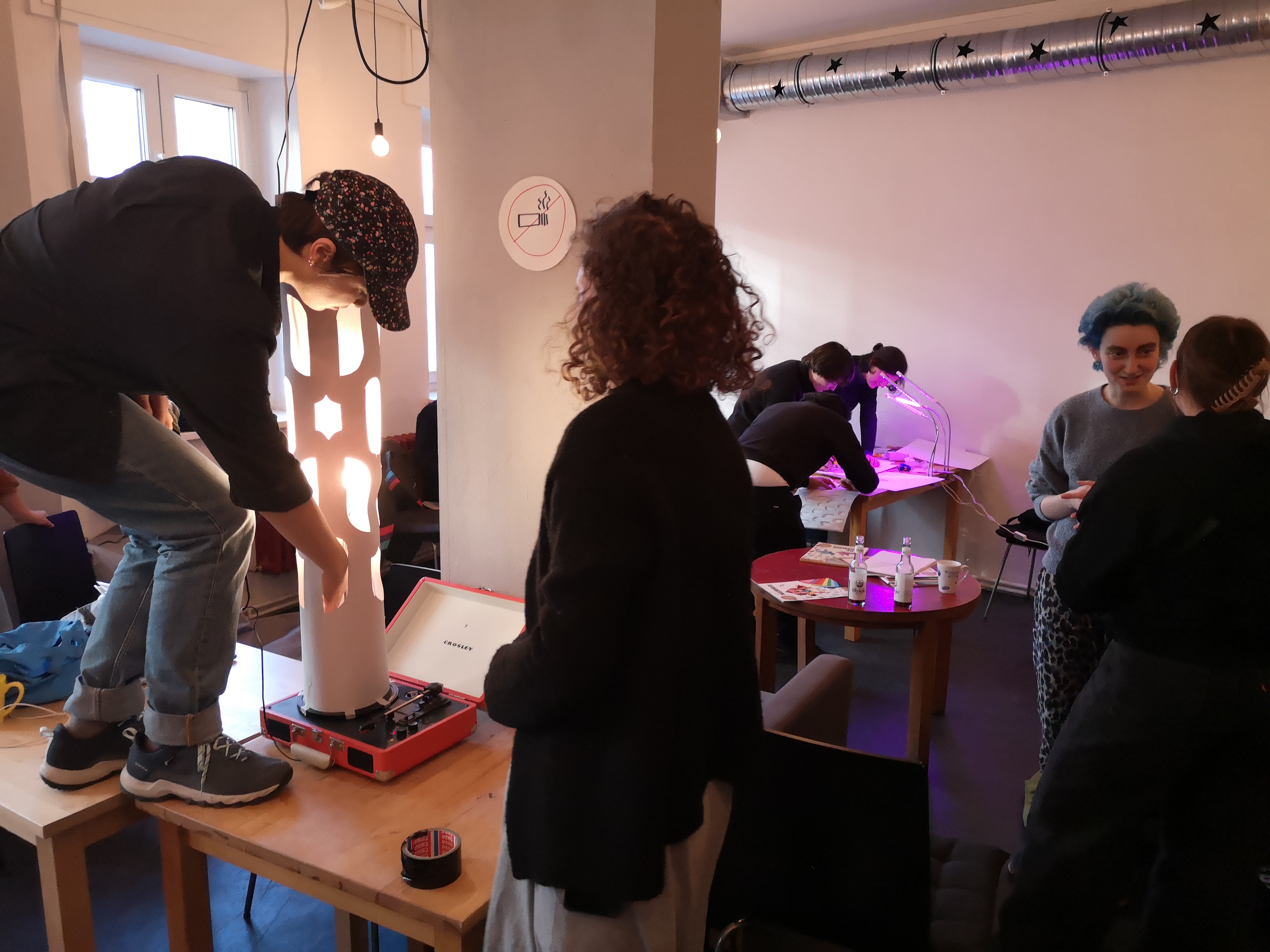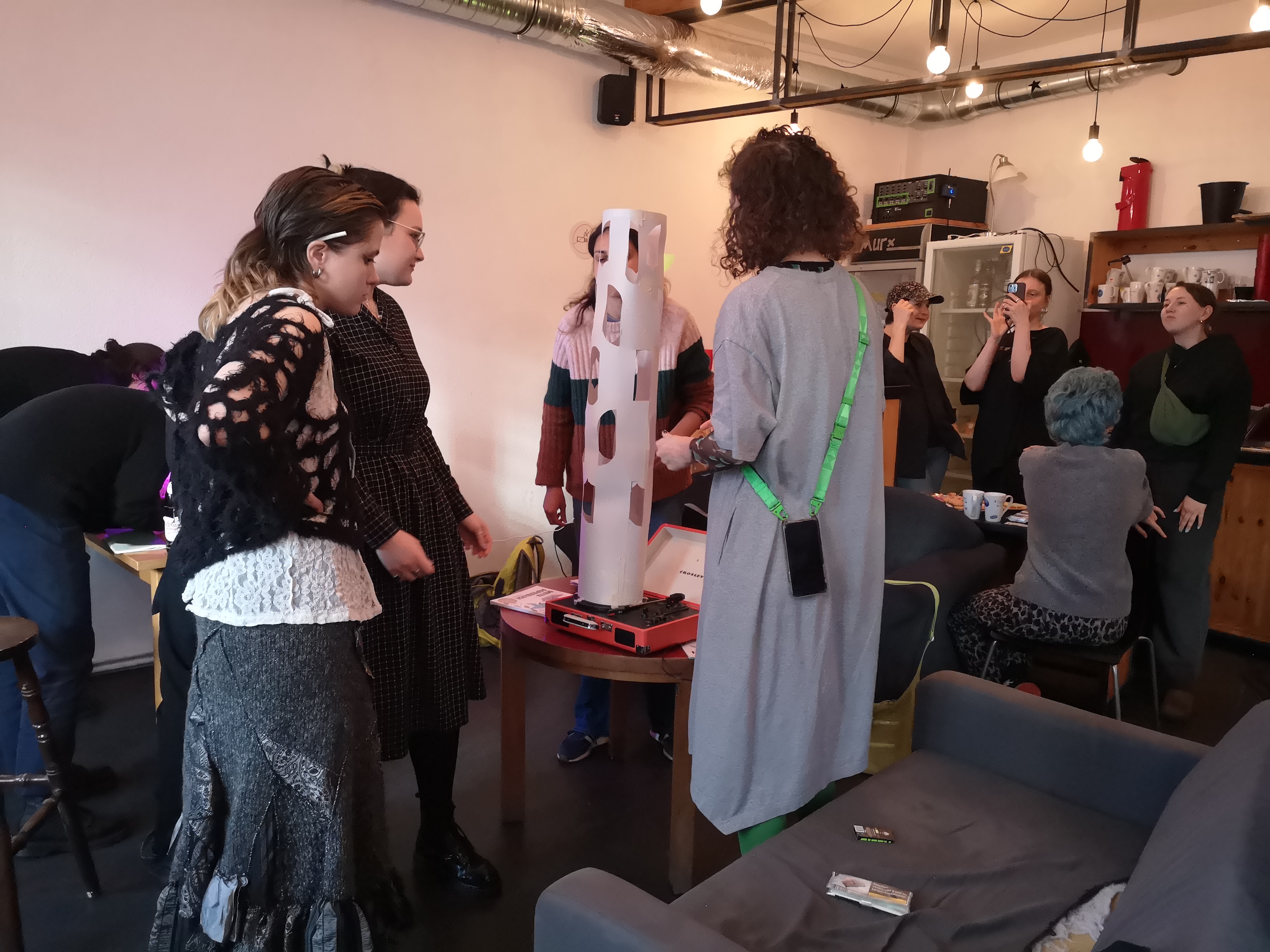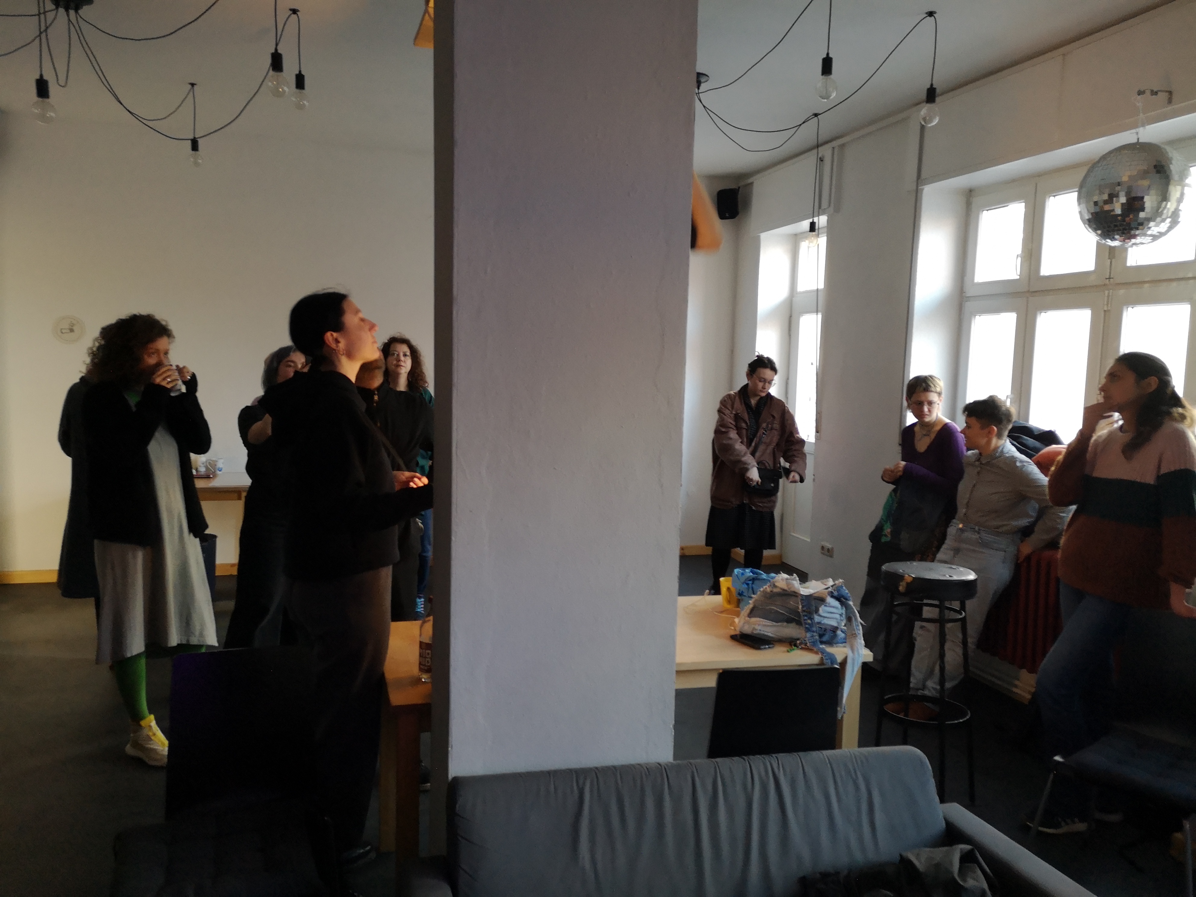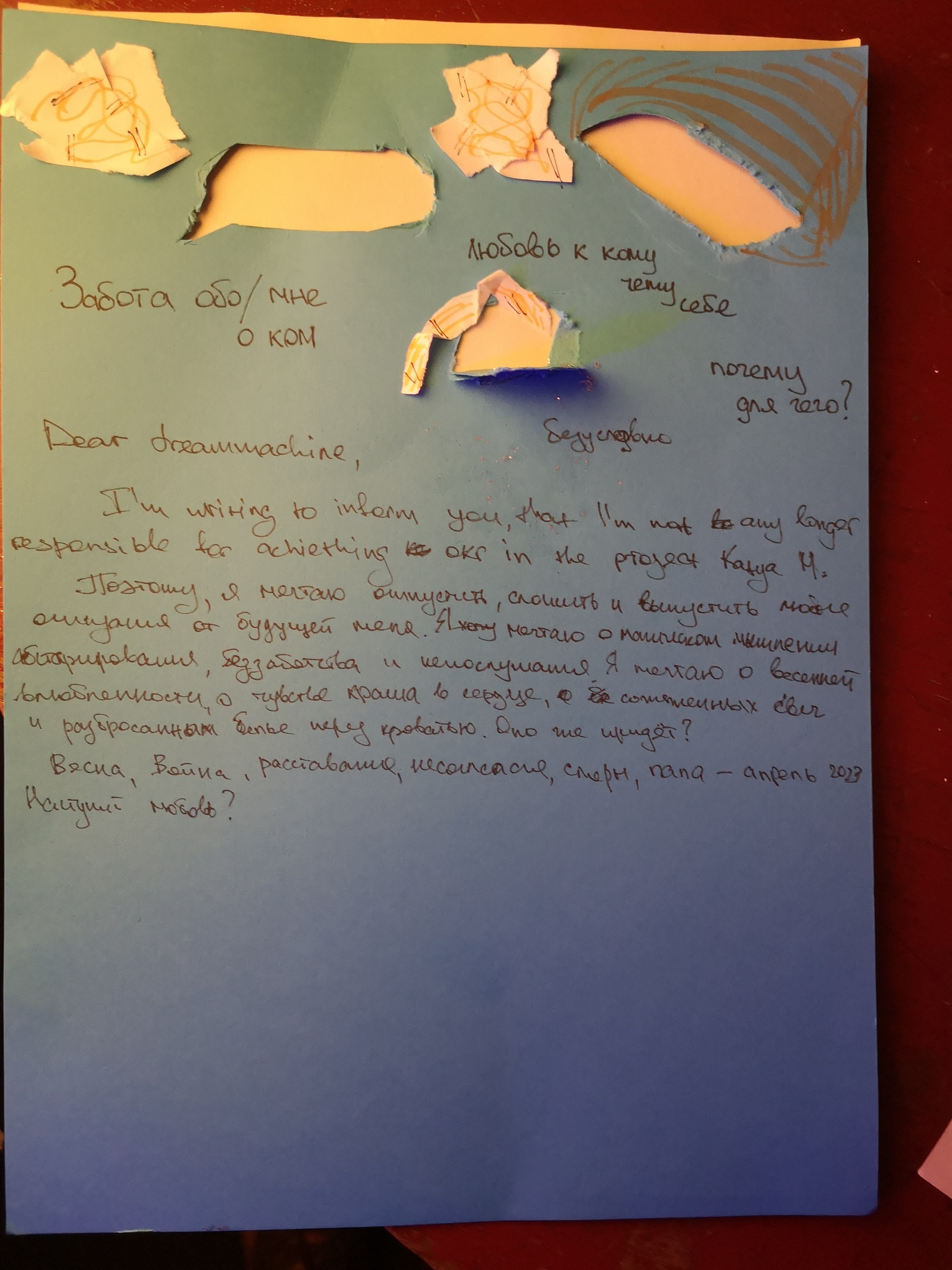 The workshop was supported by a queer feminist community consisting mostly of people with post-Soviet backgrounds. It was conducted in the context of “Өмә” [ome] exhibition at Kunstraum Kreuzberg Bethanien (runtime: 11/03/2023 to 29/05/2023) examining Russian colonialism and anticolonial resistance, and attracted around twenty participants. Most of the participants shared experience of living in countries like Ukraine, Belarus, Armenia and Russia, so the initial goals of our project to gather together queer people from homophobic countries was at least partially achieved. The workshop took place in the “Murx” activist space on April 8 2023 and was about four hours long. The outcome mostly consisted of poetry pieces, drawings, and paper crafts all of which are included into the archive.
