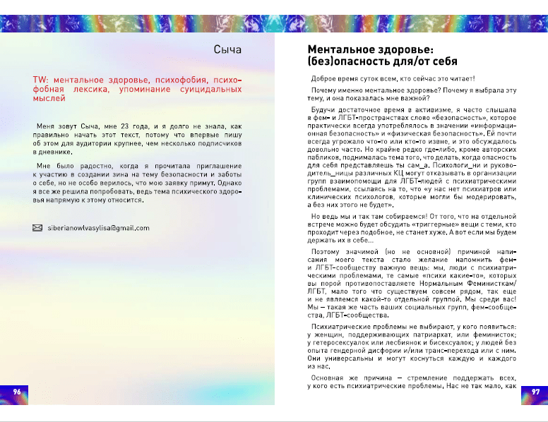 The zine is a collection of diverse experiences that transcended the boundaries of cisheteronormativity and patriarchal societal expectations. Its aim is to make the queer and feminist experiences of the inhabitants of Siberia and the Far East visible. The theme was (un)safety, partly due to the current political and epidemiological situation. The aim of the initiative was to make the zine a safer space than the world around it. Self-care is another important theme of the volume. It is a meaningful stage of recognising one’s worth regardless of achievements, especially for burned out activists and workers.