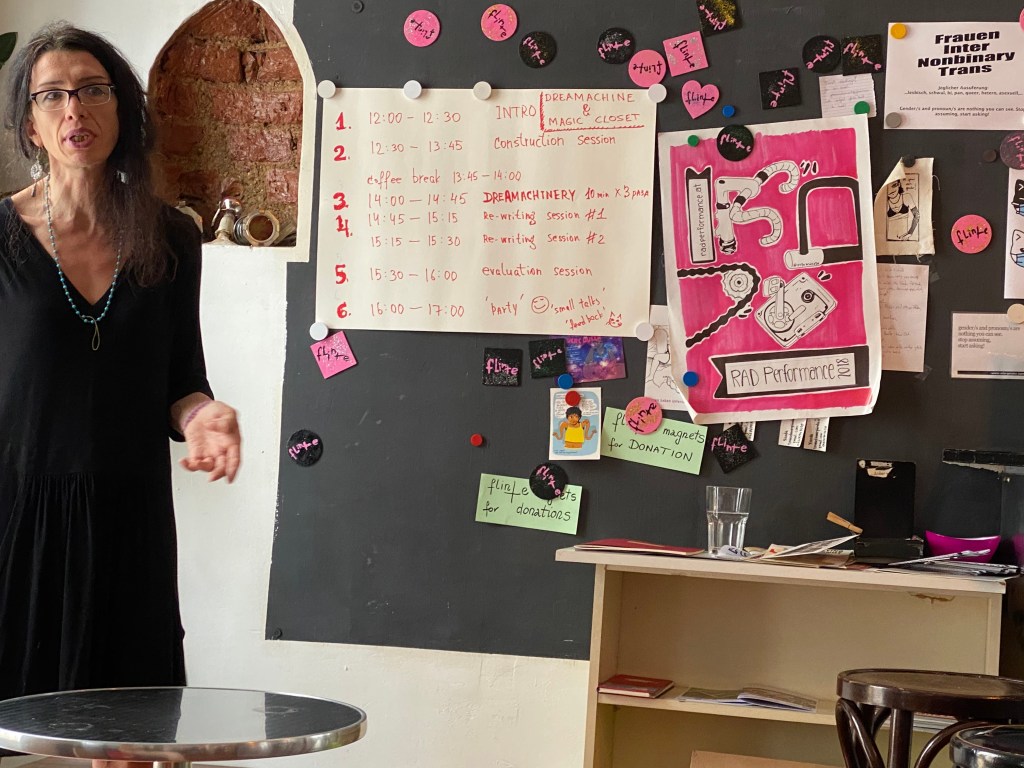 Being unable to travel in the wake of the pandemic, we have organized the very first Dream Machine workshop for the Russian-speaking community in Vienna. About ten people participated in a full-day workshop that included the project presentation, building the dream machine together, dreammachinery and free writing sessions. Many ideas were born during of this first workshop, some of which later found their embodiment in short films “Gender Dotulation” and “a text floating on a river” (both 2023).